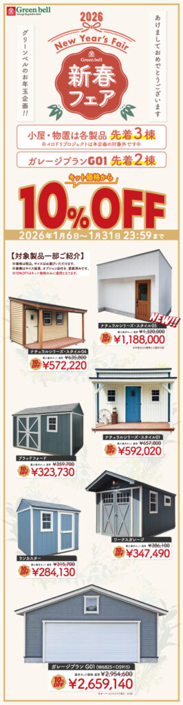 ▪︎ 小屋・物置は各製品 先着3棟、ガレージプランG01は先着2棟まで。